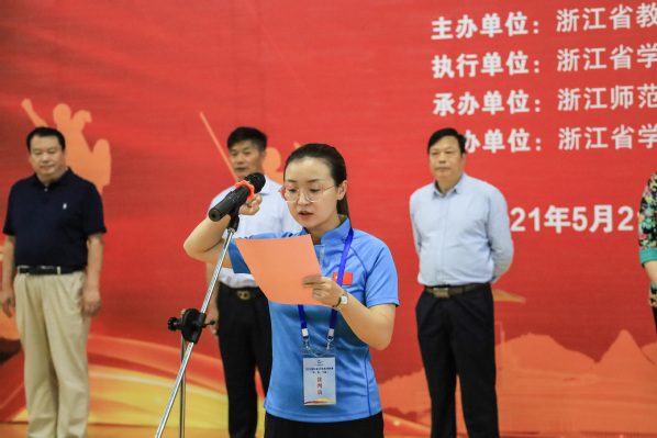 运动员俞睿峰代表全体运动员宣誓:“严格按照安排,遵守比赛规则;尊重对手,服从裁判;公平竞技,团结合作;赛出风格,赛出水平。”