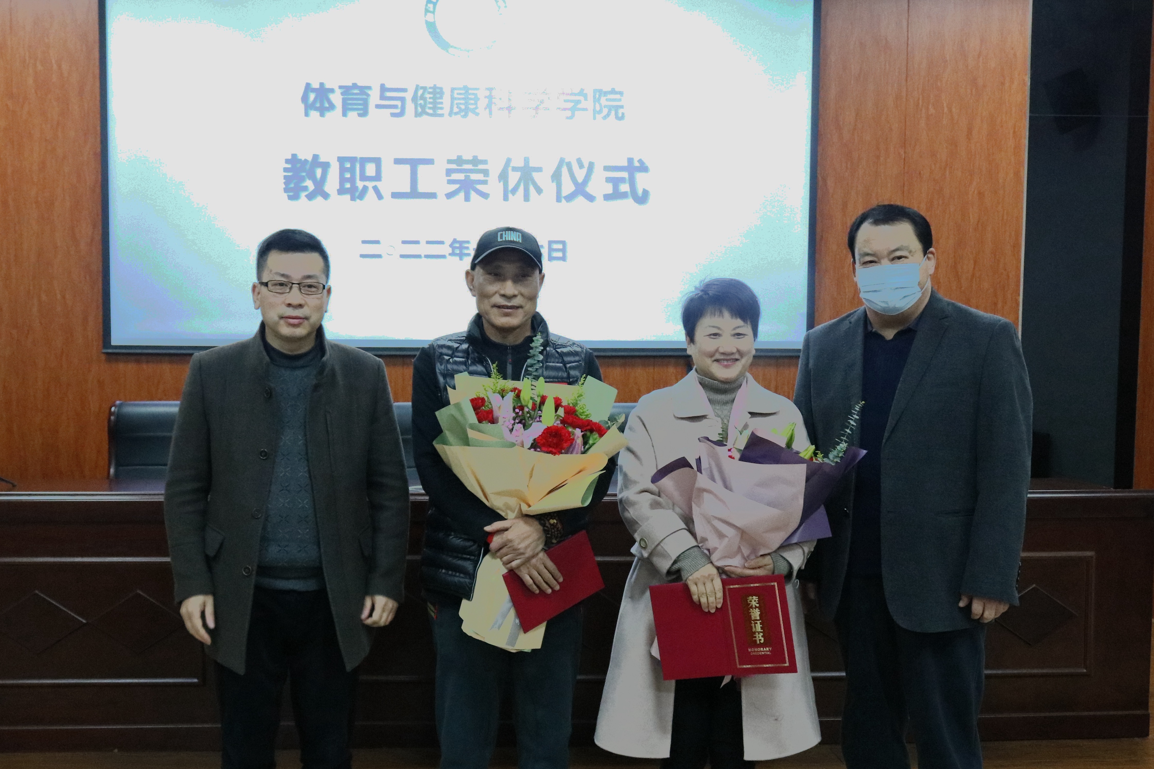 院长薛岚、党委书记姜洪友分别为两位老师颁发了退休荣誉证书,献上了鲜花。全体教职工用热烈的掌声为两位老师送上了美好祝福。