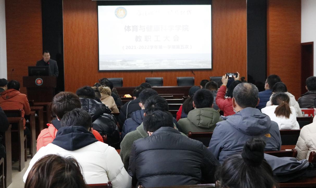 院长薛岚对本学期学院工作进行了总结,他指出2021年受到新冠疫情的持续影响,学院各项事业遇到了严峻挑战。一年来全院围绕既定战略目标,上下团结一心,在做好常态化疫情防控工作的同时,各项事业稳步推荐,在政治学习与党建工作、体育学科建设、专业与课程建设、师资队伍建设、科研与社会服务、学院文化建设等方面都取得了好成绩,多个重要方面取得突破性进展。体育学科在软科中国最好学科排名中首次进入前18%,列浙江省高校体育学科第一位;承担《浙江省全民健身实施计划》等重要政府委托技术开发项目,《浙江省全民健身状况调查与发展指数评估》项目,创单项横向课题经费新高;大学生创新创业大赛取得重要突破;三门课程获得省级虚拟仿真实验项目,两门课程获批省级一流课程;承办各级各类高端培训项目,完成教育部、省教育厅委托全省学生体质健康抽测任务。
