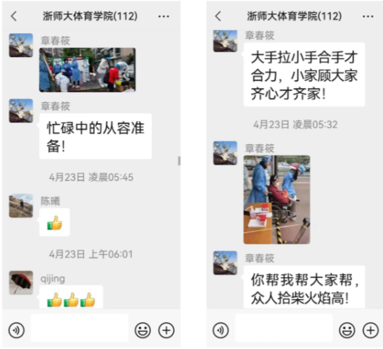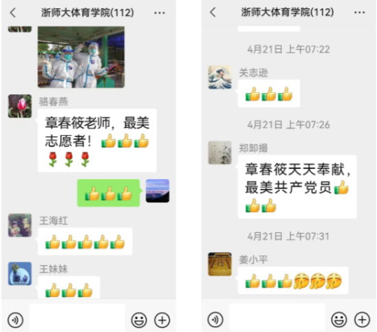 砺党性,践初心,作为一名中共党员,章春筱老师用实际行动诠释了疫情下的责任和担当。“我是一名教育者,更是一位老党员。我没有理由退缩,面对疫情,我应当尽心尽力做好每一件事。”这也是牢牢刻在章老师心中的使命。作为体育人,她用积极乐观的精神感染着身边的人,帮助他们坚定战胜疫情的信念。
