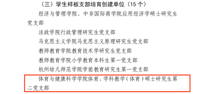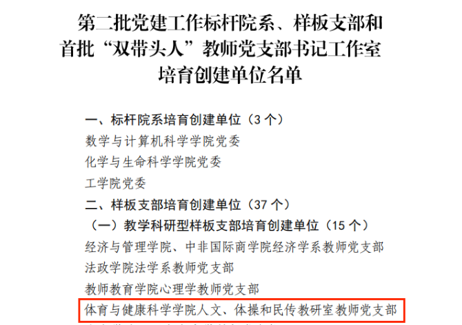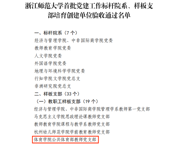 近日,beat365手机版官网党委公布首批党建工作标杆院系、样板支部培育创建单位验收通过名单和第二批党建工作标杆院系、样板支部和首批“双带头人”教师党支部书记工作室培育创建单位名单。beat365手机版官网公共体育部教师党支部通过校首批党建工作样板支部培育创建单位验收。人文、体操和民传教研室教师党支部、体育、学科教学(体育)硕士研究生第二党支部获立第二批党建工作样板支部培育创建单位。