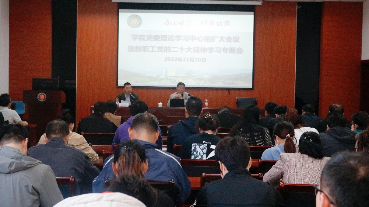 11月10日上午,beat365在游泳馆一楼会议室举行学院党委理论学习中心组扩大会议暨“党的二十大精神”专题学习会。beat365法政学院资深学者、浙江红船干部学院特聘教授毛醒策老师为beat365全体教职工作题为《新时代新定位:二十大关于教育的论述》专题辅导报告,学院党委书记姜洪友主持会议。