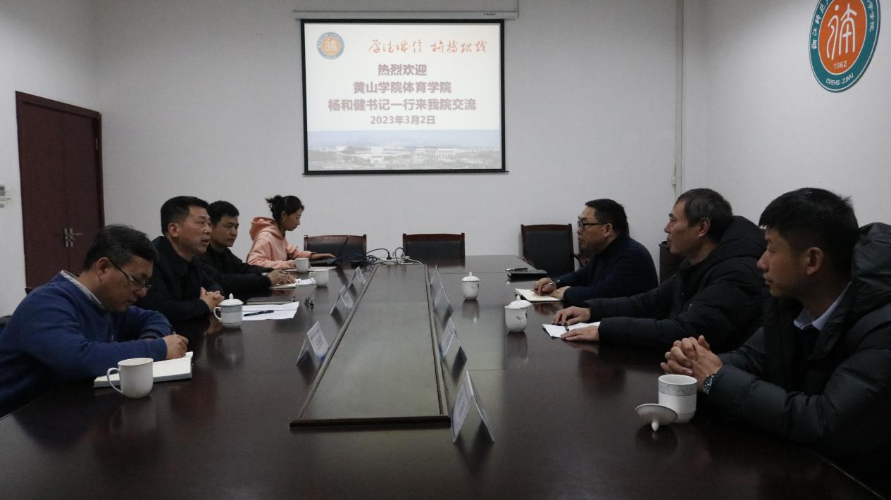 2023年3月2日,黄山学院体委副主任、校体委办公室主任、体育学院党总支书记杨和健一行4人来beat365交流,党委书记姜洪友,党委委员、公体部主任沈军,办公室主任王海红参加座谈会,会议由党委书记姜洪友主持。双方就党的建设、专业建设、课程思政、大学体育俱乐部改革、学生运动竞赛等议题进行了交流与探讨。
