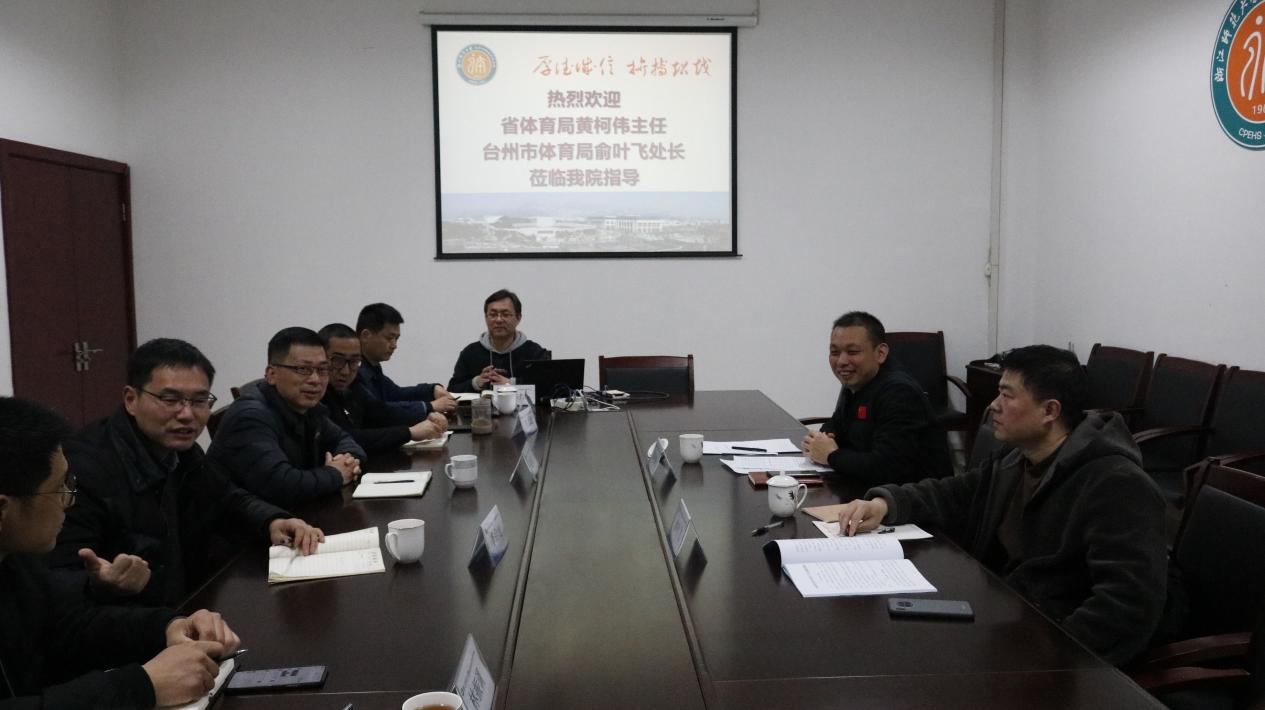 2023年2月16日,浙江省体育局群体处一级主任科员黄柯伟、台州市体育事业发展中心群体处负责人俞叶飞一行来beat365指导交流,全体班子成员参加座谈会,会议由院长李启迪主持。