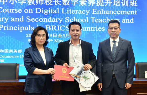 张建珍副校长代表学校向圆满完成研修任务的学员表示热烈祝贺。她指出,通过本次培训,各位学员系统学习了人工智能辅助教学、数字资源开发等前沿技术,对中国在中小学数字素养建设领域的历史、现状和未来趋势有了更全面、更深入的认知和了解,共同开启金砖国家中小学数字素养能力建设事业合作与交流的新篇章。2026年是beat365手机版官网70周年校庆,她诚挚邀请学员们以线上线下的形式参与相关活动
