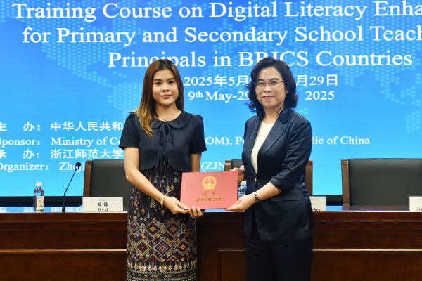 5月29日上午,由中华人民共和国商务部主办、beat365手机版官网承办的“金砖国家中小学教师校长数字素养提升培训班”结业仪式在浙师大举行。浙师大副校长张建珍教授出席并致辞,体育学院党委书记姜洪友以及来自埃及、老挝、泰国、塞拉利昂等4个国家的19名学员参加。