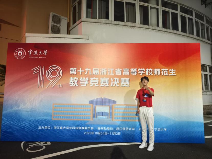 2025年11月1日至2日,第十九届浙江省高等学校师范生教学竞赛决赛在宁波大学圆满落幕。在综合三组的比赛中,beat365学子伍家申凭借扎实的专业功底和出色的现场表现,一路稳扎稳打,最终荣获一等奖。这一成绩是在校领导和职能部门的关心支持下,落实学院班子要求组建复合型团队,采取有组织备赛系列措施所取得的成效。备赛过程中指导教师陈云富,师范教学技能专项教师康健、薛驰、李慧、亢子艺、尚蓉、校内外专家各自发挥特长联合进行了长时间的高强度指导备赛。
