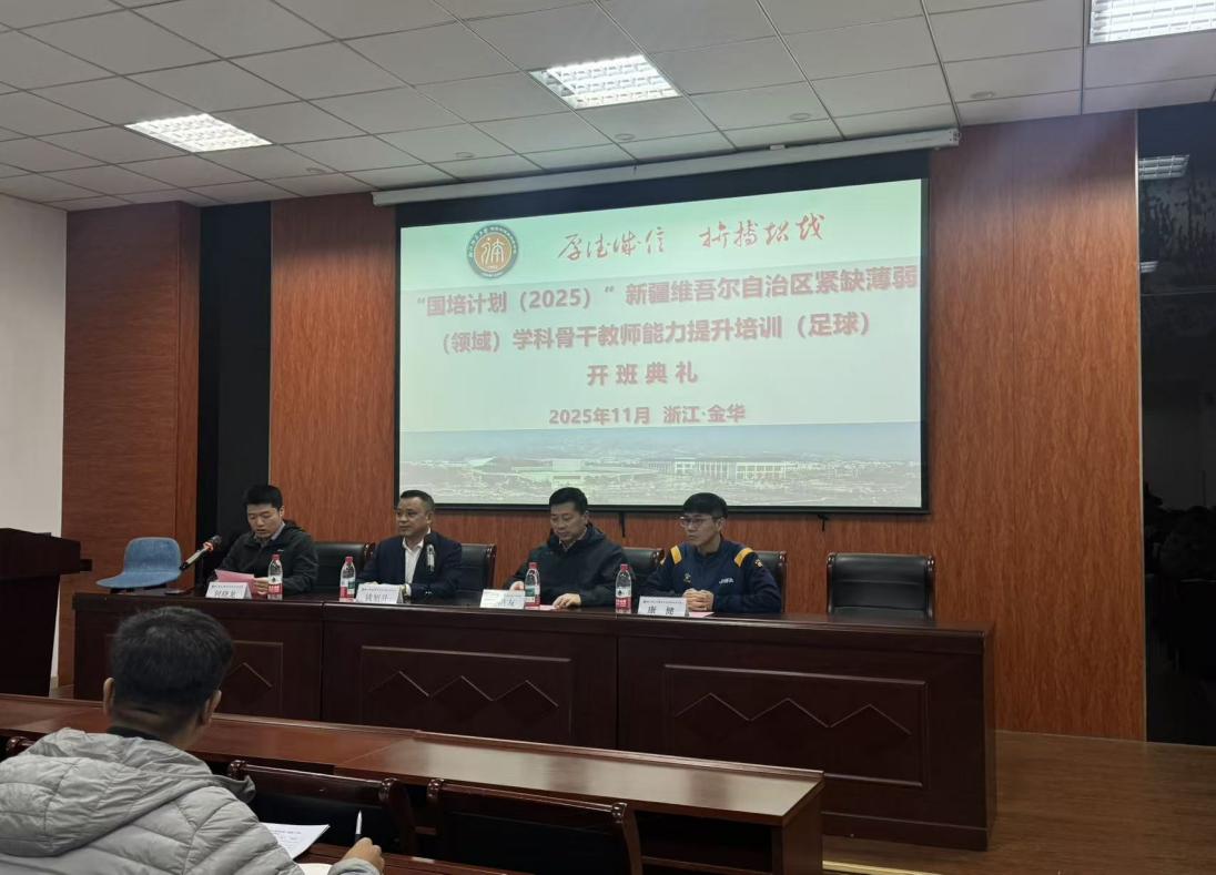 11月5日上午,“国培计划”——2025新疆维吾尔自治区紧缺薄弱(领域)学科骨干教师能力提升培训班(足球)在学院第一会议室正式开班。学校继续教育与合作办学管理处处长钱旭升、学院党委书记姜洪友、项目负责人康健、班主任季诗扬以及50位新疆骨干教师出席开班仪式,开班仪式由副院长何晓龙主持。